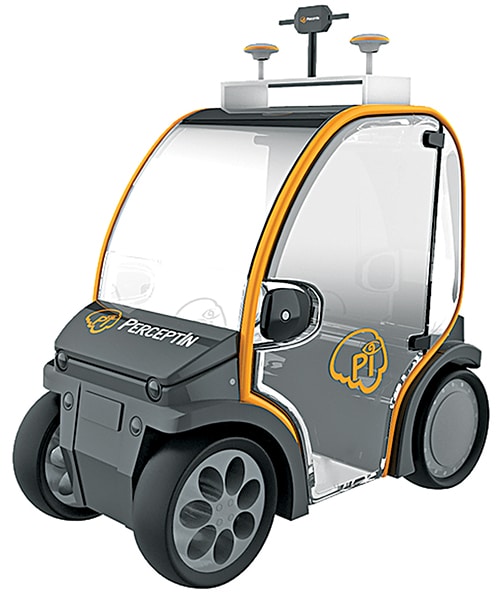 Machine learning algorithms help the vehicle identify the fastest route to the destination. The vehicle comes with multiple proprietary sensory products created by PerceptIn, including DragonFly computer vision module on top, Global Navigation Satellite System (GNSS) modules next to the computer vision sensor, and sonar and 77GHz millimetre-wave radar on the front.