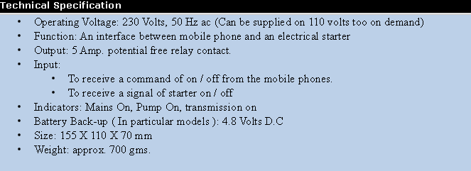 Nano Ganesh- GSM is a wireless controller that receives the controlling demands from the farmer’s mobile phones. The controlling demands may be to turn the motor on or off, or to check the status of the power or the load. The GSM modem is installed in the starter panel which are normally made of galvanized or M.S. Sheets and are placed outdoor in the farms or near the water pumps. The unit contains a simple hinged door for the panel to secure it with lock and key arrangement. It also has an external antenna for the GSM unit. The power supply to the GSM unit is supported with additional battery back-up and the unit also contains relay contacts in order to control the no volt coil of the starter or auto switch. It is equipped with Auto/Manual switch in case of emergency need of irrigation. There is also an infra red sensor installed in the starter panel so that whenever a panel door is opened, an alert SMS or call is sent to the farmer’s mobile phone.