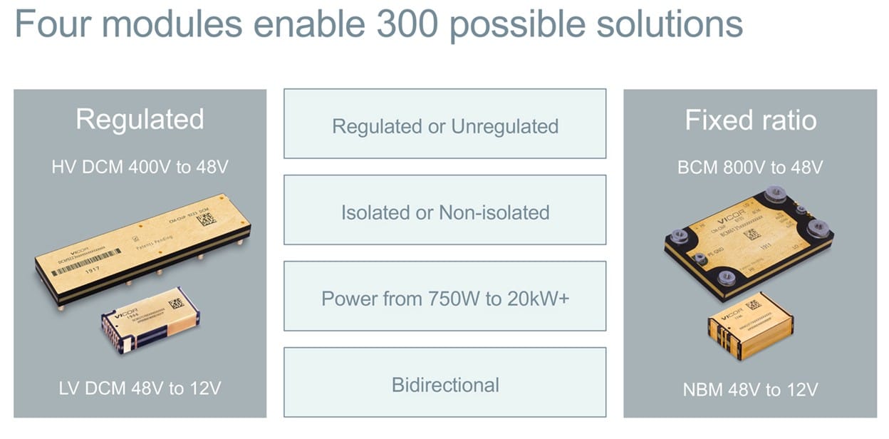 Additionally, the Vicor modular approach allows engineers to achieve approximately 300 combinations of power delivery by using just three to four scalable building-block modules of various types. (Figure 4) This design approach amounts to hundreds of hours of time and resource savings, allowing OEMs get out in front in the electrification race.