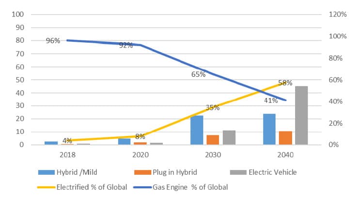 A. Figures 2 and 3 highlight the market trends. The EV market shows slower adoption, while Plug-in has benefits with convenience and real time Co2 emission savings. At the same time, HEV is expected to grow from 4% to 19% worldwide from 2020-2030.