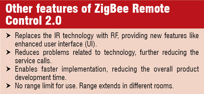 The ZigBee Remote Control 2.0 uses faster and more reliable radio frequency (RF) technology as compared to infra-red (IR) for operation from greater distances. It consumes less power than IR and provides a fast and reliable bi-directional communication network, with an over-the-air update. Hence, it does not require to be connected with any external hardware for updates.