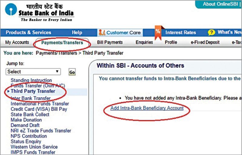2. On the account page, choose Third-Party Transfer option in the drop-down list. You will be directed to Add Beneficiary link; click on it (Fig. 2). You might have to provide your security password for that.