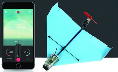 PowerUp Dart is a little kit that makes your paper planes smarter. You begin by folding the colourful papers provided with the kit to make cute little planes. Then, attach the small, pen-cap-sized Dart module to it. Connect the Dart-fitted plane to your mobile app, and you are ready to make your plane perform aerobatic stunts! Your plane can perform spins, hammerheads, barrel rolls, wingovers, loops, scissors and more.