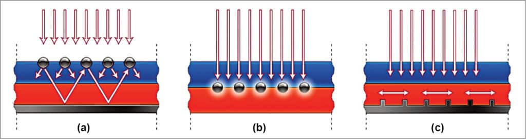 If the SEG is provided with reflecting metal back contact, light reflected towards the surface will combine with the nanoparticles and partly reradiate into the wafer by the same scattering mechanism (Fig. 4). As a result, the incident light will pass several times through the silicon semiconductor film, increasing the effective path length.