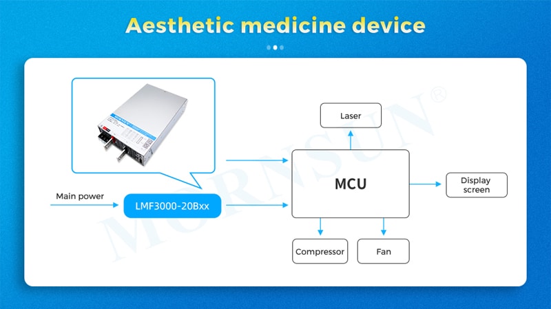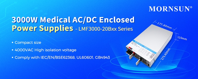 MORNSUN, with its strong research and development capabilities, has launched the high power density 3000W LMF3000-20Bxx series AC/DC switching power supply. These products have advantages such as high efficiency (93%), wide operating temperature range, are designed to meet medical certification, and are suitable for medical and other applications.