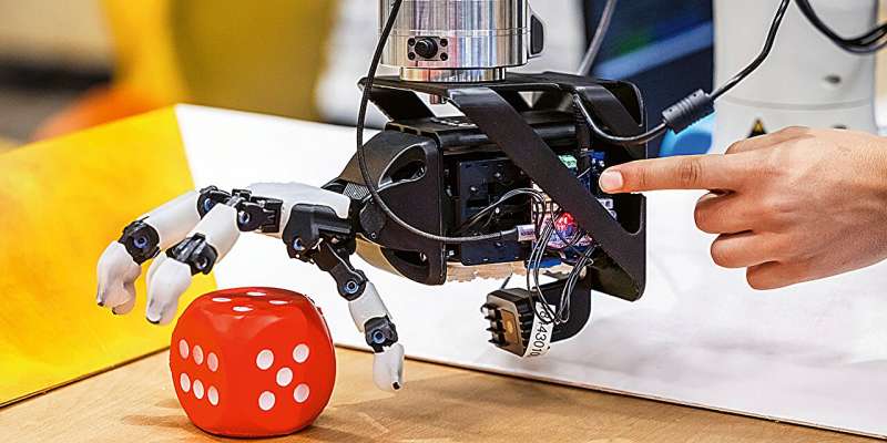 Dexterous, tendon-driven robotic hand performing a task learnt through imitation. Credit: Soft Robotics Lab / ETH Zurich