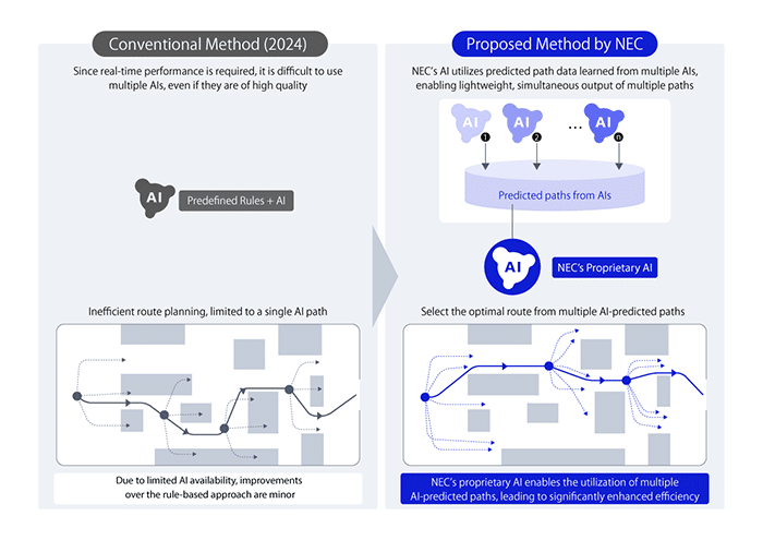 NEC Corporation has unveiled an AI-based robot control technology that enables safe and efficient autonomous movement, even in cluttered environments filled with obstacles. Demonstrations show that robots using this technology complete tasks in half the time compared to conventional methods—potentially doubling productivity at worksites. NEC plans to commercialize the solution by fiscal 2026.