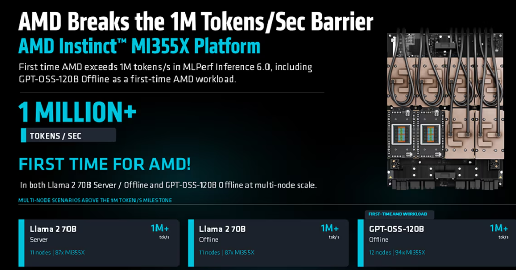 The milestone was achieved using AMD Instinct MI355X GPUs running large language models such as Llama 2 70B and GPT-OSS-120B across multinode clusters. The results highlight a shift from single-node benchmarking to rack-scale, real-world deployment metrics in which throughput and latency define usability.