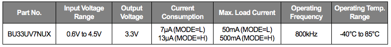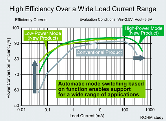 Adopting a low-power mode for standard products (50mA max. load current, 7uA current consumption, PFM control), and automatically switching to high-power mode for high-performance (500mA max. load current, 13uA current consumption, PFM/PWM switching control), make it possible to achieve high efficiency power conversion as high as 94% under a wide range of conditions.