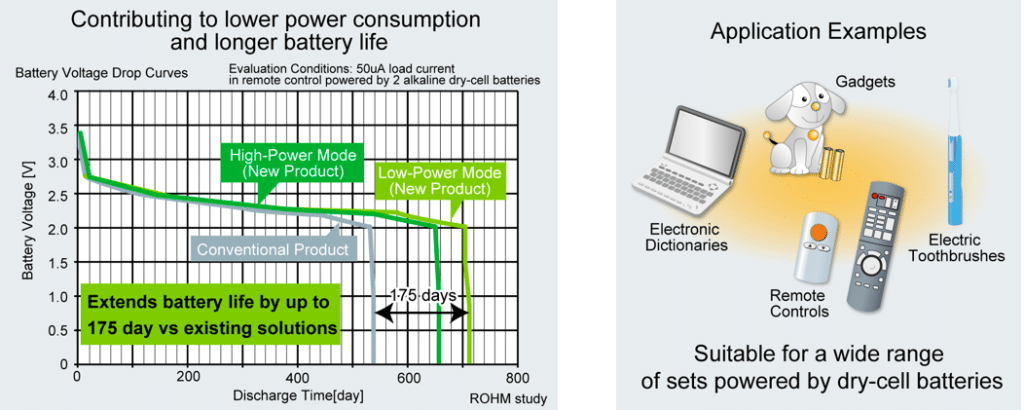 In order to prolong operating life with dry-cell batteries, ROHM leveraged original analogy design technologies and power system processes to achieve a current consumption of just 7uA, the smallest in the industry among functionally equivalent products. This makes it possible to increase battery life in conventional remote controls powered by 2 alkaline dry-cell batteries by approx. 1.3x over existing solutions, providing an extra 175 days of operation (ROHM study, assuming standby mode and a load current of 50uA). In addition, the BU33UV7NUX can be driven by input voltages as low as 0.9V and supports both single dry-cell and button-type lithium-ion battery sets. Plus, the built-in battery leak detection function makes it particularly suited for dry-cell applications.