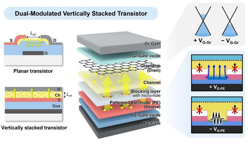 A research team led by scientists at the Daegu Gyeongbuk Institute of Science and Technology (DGIST) introduced a dual-modulated vertically stacked transistor that maintains stable operation even at nanoscale dimensions. The design incorporates a dual-gate structure that improves control over the channel and suppresses unwanted current leakage—an issue that becomes more severe as transistors shrink and are stacked vertically.
