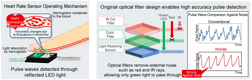 In response, ROHM leveraged original infrared filtering technology and optical sensor expertise cultivated over many years to develop a low power heart rate sensor that provides high accuracy measurement even under strong IR environments such as direct sunlight or during intense motion activities. And the high-speed sampling rate meets the continuously evolving needs of the IoT and wearable markets.