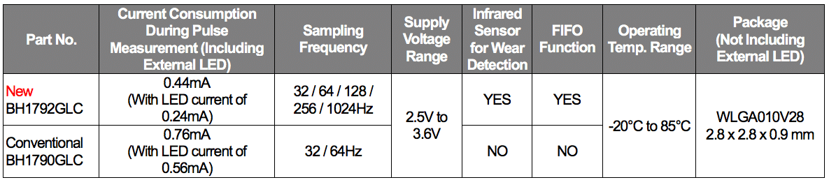 ROHM has recently announced the availability of an optical heart rate sensor for smart bands and watches capable of measuring blood pressure, stress and vascular age at a high-speed 1024Hz sampling rate. The BH1792GLC, which is ROHM’s 2nd generation optical heart rate sensor, features its high accuracy and low power consumption. A current consumption of only 0.44mA (during heart rate measurement), the lowest in the industry*, contributes to longer operating time. And the 1024Hz sampling rate makes it possible to measure heart rate up to 32 times faster than conventional solutions while also supporting vital sign sensing such as vascular age and stress measurement demanded by the latest wearable and fitness devices.
