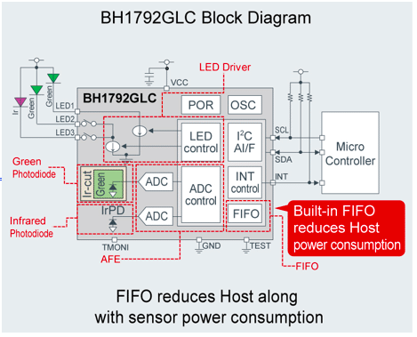 In addition, unlike conventional products, a FIFO (First In First Out) buffer is added to reduce power consumption of the Host side controller (e.g. MCU, Applications Processor etc.). This decreases the power consumed by the pulse sensor, contributing to longer application battery life.