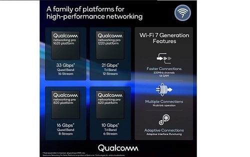 Qualcomm has announced a new line of Wi-Fi 7 ready family of platforms called the Networking Pro Series. The Wi-Fi 7 leverages advanced technology to maximize overall capacity, decrease latency and increase the speed of every device. It is the third-generation of professional networking platform from the chip manufacturing giant. The lineup of Wi-Fi chips supports multiple channels and has been developed for enterprise access points, premium home routers, and advanced mesh systems. The Wi-Fi 7 is capable of achieving 4x data transfer rates compared to its predecessor Wi-Fi 6E.