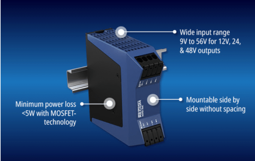 A new high-efficiency redundancy module from RECOM is targeting factory automation, process control and mission-critical industrial systems that cannot afford power interruptions. The RACPRO1-RD40 delivers up to 40A in a compact DIN-rail package, offering designers a simpler way to build redundant or load-sharing power architectures without the bulk and loss penalties of traditional diode-ORing solutions.