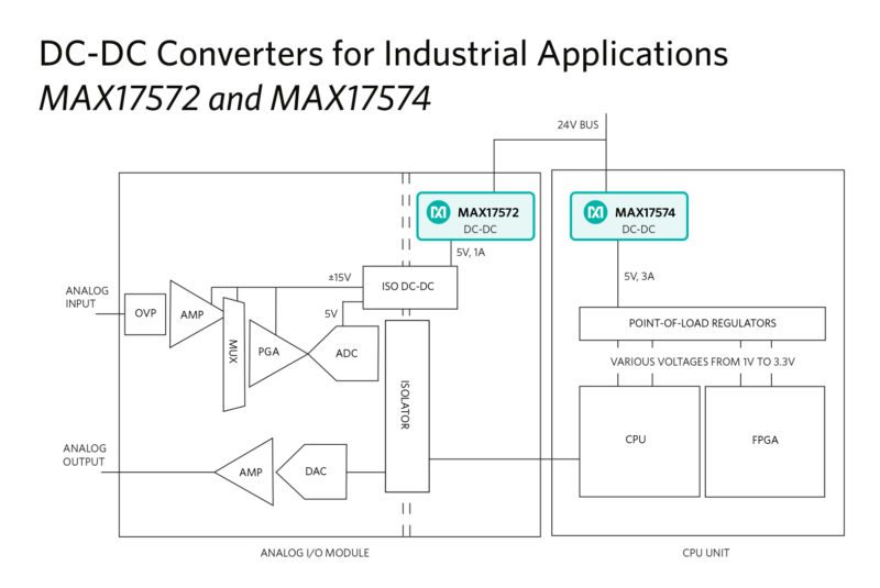 With Maxim’s MAX17572 and MAX17574 DC-DC converters, designers can operate 4.5-60V as well as reduce power dissipation and solution size compared to other solutions to rapidly comply with the IEC 61508 safety standard. The converters guarantee 1A and 3A operation (5V output) and are ideal for high voltage industrial applications such as sensors, programmable logic controllers (PLCs), industrial controls, distributed supply regulation, and factory/building/power grid automation. They are also applicable for battery back-up, Power-over-Ethernet (PoE), and data centers. Operating over the -40-degree Celsius to +125-degree Celsius temperature range, the MAX17572 is available in a 12-pin, 3mm x 3mm thin-DFN (TDFN) package and the MAX17574 is available in a 24-pin, 4mm X 5mm TQFN package.