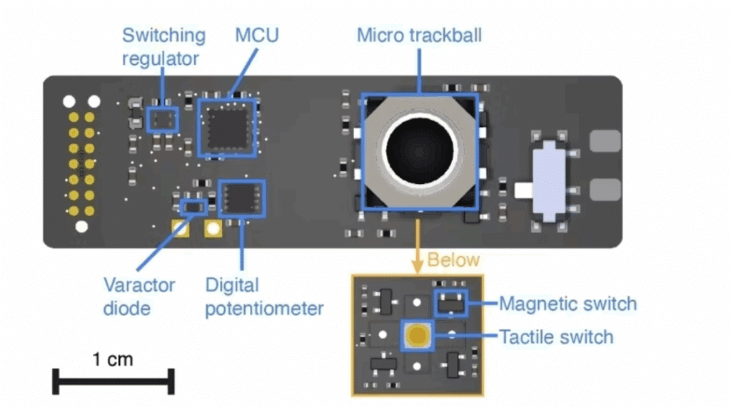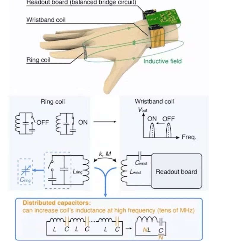 Weighing just five grams, the ring houses an eight-turn resonant coil with distributed capacitors and a miniature trackball module. As the wearer scrolls or presses, embedded magnets and tactile switches register motion, while a microcontroller translates the action into signal variations detected by a matching coil in a wristband receiver. The wristband, though still in prototype form, acts as a bridge between the ring and connected devices such as computers or VR headsets.