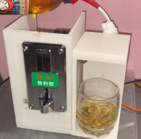 Next, pass the pipe connected to the container through the 3D printed part of the vending machine. This end will allow the liquid to flow into the drinking glass kept underneath (see below pictures).