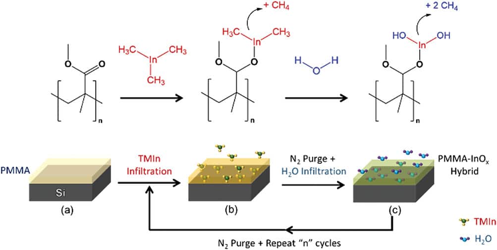 This material, made of poly(methyl methacrylate) (PMMA) combined with indium oxide (InOx), is created using a method called vapor-phase infiltration (VPI). VPI is a way to make hybrid materials that come from a process similar to atomic layer deposition.