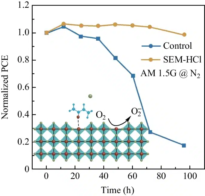 The devices created using SEM-HCl show a peak efficiency of 10.9%, showing significant improvement. These devices demonstrate improved stability, maintaining almost 100% of their initial efficiency after 100 hours of continuous operation under AM1.5 illumination conditions. AM1.5 refers to a standard solar spectrum that simulates sunlight on earth.