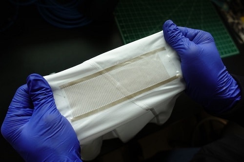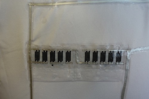 All of the parts are connected with flexible silver interconnections that are also printed on the shirt and insulated by waterproof coating. The performance of each part is not affected by repeated bending, folding and crumpling or washing in water—as long as no detergent is used.