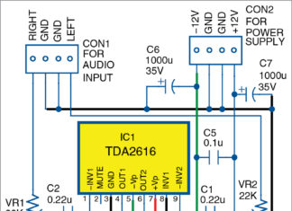 Here is a simple hi-fi audio stereo power amplifier based on TDA2616 IC. This amplifier works on two 12V batteries or one ±12V AC/DC...