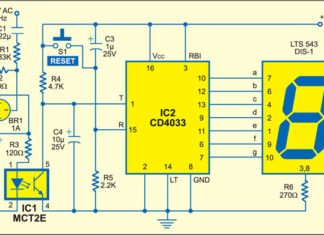 This mains interruption counter circuit counts mains supply interruptions (up to 9) and shows the number on a 7-segment display. It is highly useful...