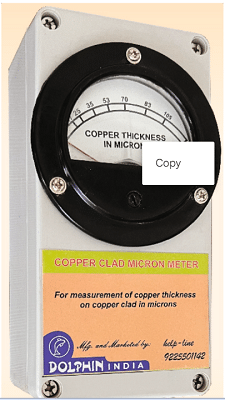`DOLPHIN `make three models of `COPPER CLAD MICRON TESTER / METER are useful handy tools to check thickness of the copper layer of the copper clad in microns. The devices check the most commonly available copper clad from 12 to 140 micron. You have to just press the sensor face of the unit on plane and clean copper surface and press the push button. In `ECONOMY` model four ranges 17/35/70/105 microns are available. In universal model 12/17/25/35/53/70/83 /105/125/140 are available. In copper clad micron meter analogue meter will directly show the reading in micron. All three models are 9VDC battery operated. Very useful and handy tool for copper clad dealers and PCB manufacturers.