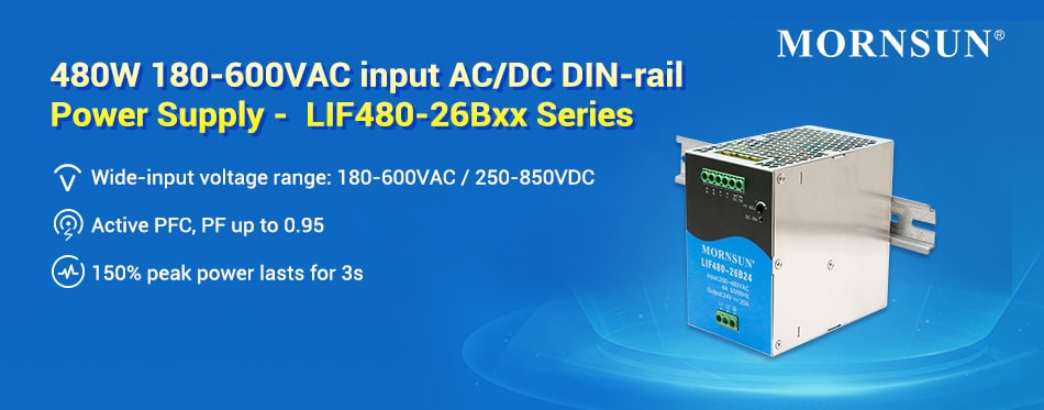 MORNSUN has unveiled a new addition to its LIF family – the LIF480-26Bxx, a 180-600VAC wide-input ranged AC/DC DIN-rail power supply. They are the reliable and affordable power supply to meet the demands of single-phase or 2-phase applications.