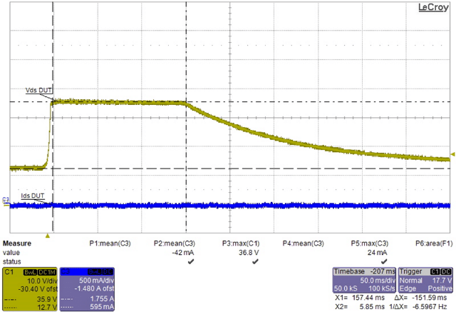 In both cases, the power MOSFET is capable of withstanding the linear mode working conditions, which match the theoretical safe operating area (SOA), preventing the device from any thermal runaway.