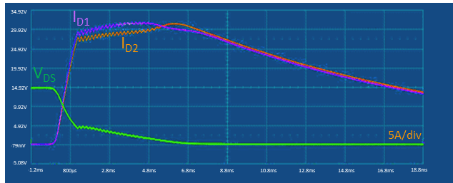 At start-up, the eFuse provides a defined ramp-up of the output voltage to ensure the inrush current is maintained within safe confines, thus protecting both the load and the power supply. This condition places a severe constraint on the power MOSFETs which have to manage the soft charge phase of the bulk capacitor array present at the ECU input, withstanding a constant current under linear mode operation.