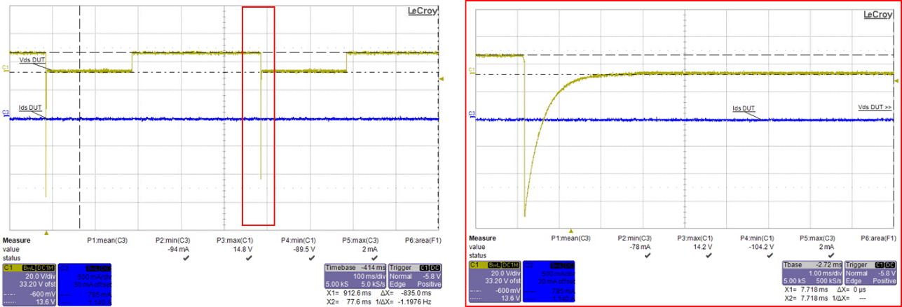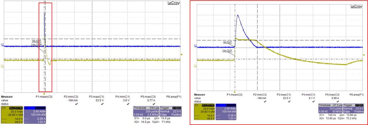 In case 1, the linear mode ruggedness of the power switch is tested for a long pulse time, which is close to DC operation.