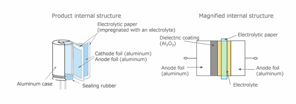 In a standard aluminum electrolytic capacitor, you’ll find a strip of electrolytic paper placed between two aluminum foils. One acts as the anode and the other as the cathode, and they’re rolled together. The paper is soaked in a liquid electrolyte, which helps connect the two foils electrically.
