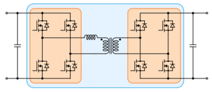 Dual Active Bridge Converter (DAB) consists of a full bridge with active switches on both the primary and secondary sides connected by a high-frequency transformer (Fig 8). Typically used for EV charging applications due to its high-power density, high-efficiency, buck and boost capability, low device stress, small filter components, and low sensitivity to component variation. The control of the DAB ranges from simple (or single-phase shift modulation) to complex (for extended, dual and triple phase shift modulation). This topology can be used to cover a wide variation of battery voltages with single phase shift modulation but circulating currents in the transformer increase which drastically reduces efficiency. But with advanced modulation schemes like triple phase shift, the converter can theoretically achieve ZVS over the entire operating range.