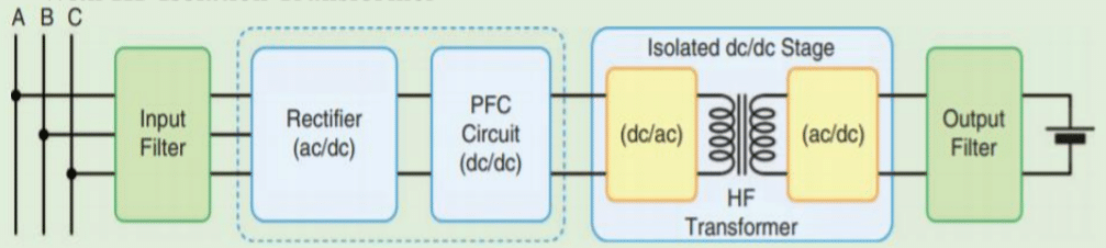 Presently all the off-board charger has two stages – Power Factor Corrector (PFC) and DC-DC Converter stage with isolation provided by the high frequency transformer (Fig 1). The usage of Wide Band Gap Devices (WBG) makes the system operate at high frequency which in turn makes the charger light in weight, lower cost, higher efficiency, and faster charging power; though we are now switching at higher frequency which makes the switching losses dominant.