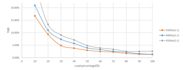 The PFC efficiency measurement under various operating load conditions and different AC input voltage conditions. At 400 VAC (L-L) condition, this reference design provides a 98.56% peak efficiency. At 450 VAC (L-L) condition, the reference design can reach a 98.75% peak efficiency.