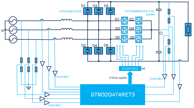 The Vienna rectifier works as a three-phase boost converter that steps up the AC mains input voltage to 800 VDC output while forcing a sinusoidal input current that is in-phase with the input voltage on all three phases. Each phase consists of a boost inductor, a pair of rectifiers (STPSC40H12C SiC Schottky diodes) and a set of series connected MOSFETs (each position uses two paralleled SCTWA90N65G2V-4 SiC MOSFET). The MOSFETs are connected to the center point of a capacitive divider, which reduces the voltage stress on the SiC MOSFETs. Two SiC Schottky diodes of each phase are used for boosting during the input AC voltage positive and negative alternation. The driving circuit is an STGAP2SICS galvanic isolated driver IC for SiC MOSFETs. It provides 4 A driving current capability and a common mode transient immunity (CMTI) up to 100 V/ns.