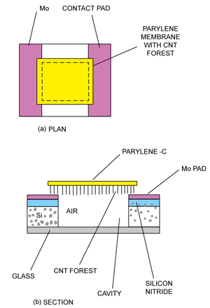 As shown in Fig. 8, multiwalled CNT forest is supported on a 5×5mm2 membrane of parylene-C of 8µm thickness. The two opposing ends of the forest are connected with the 130nm thick Mo metal pads on the substrate that are used to measure the resistance of the forest.