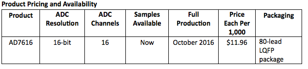 The AD7616 DAS is suitable for a range of distribution applications such as relay protection for low-voltage distribution and feeder terminal units. The new device is also ideal for multiphase motor control and industrial instrumentation applications.