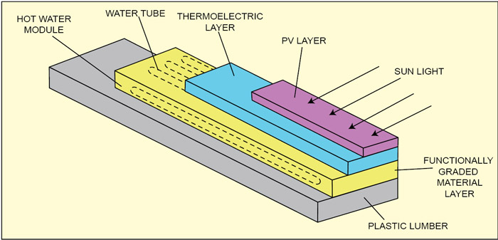 Pure aluminium powder and HDPE matrix are used to fabricate the functionally graded material layer. The 6.4mm dia. water tubes are made with copper. The plastic lumber substrate is made of recycled polymeric materials instead of conventional bismuth-telluride modules. If the design is adopted with quantum-well (QW) and quantum-dot (QD) thermoelectric modules, much higher efficiency can be achieved. However, currently most quantum-well and quantum-dot structures are fabricated with molecular beam epitaxial technique, which is expensive.