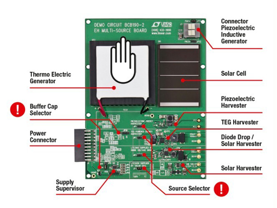 There are four voltage converters of Linear Technology on the multi-source energy harvesting board as well. These are optimized for the different energy sources like for solar, electromagnetic, piezo-electric or thermal energy converters.