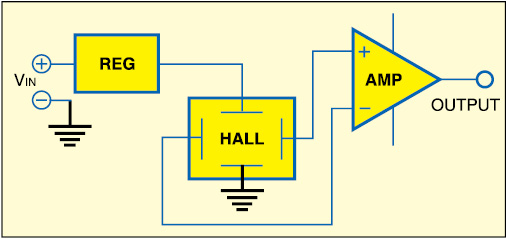 The additional electronics needed is a differential amplifier and a temperature compensation circuit. Voltage regulation is also required when operating from an unregulated supply. When the Hall element is combined with this associated electronics, it forms a ready-to-use Hall effect sensor, which is an integrated circuit chip that contains a Hall element and the signal conditioning electronics.
