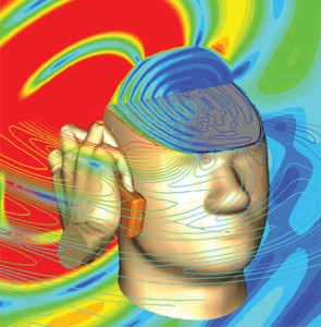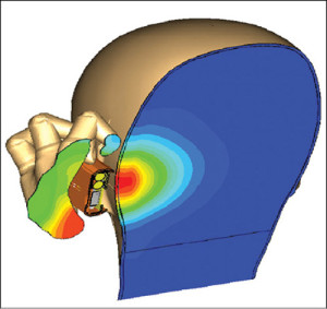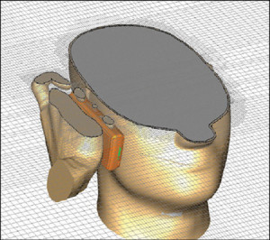 Simulation of the mobile phone, with head and hand models, requires tens of millions of mesh cells and a simulation run-time of five to six hours on a PC (Intel Core i3 CPU, 64-bit operating system, 2.13GHz, 4GB RAM). The number of mesh cells can be reduced using the sub-gridding scheme. When applied, a very fine mesh is created inside the phone, a coarser one in the head and a very basic one in the vacuum (Fig. 2).