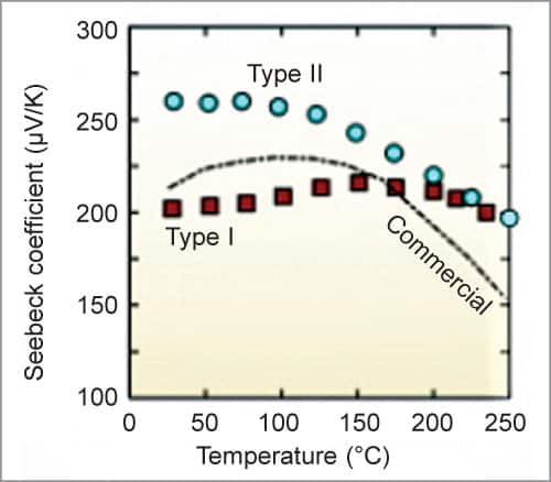 Fig. 7: Seebeck coefficient of improved Type I and Type II BiTe material - Lead telluride (PbTe) alloy: Low conversion efficiency is a big obstacle that impedes large scale application of TE materials for power generation. Lead telluride alloy is recognised as an excellent compound for power generation in the mid temperature range of 500-800°K. It has highly symmetric rock salt crystal structure, which is chemically and thermally stable. Lead telluride can be made either a p-type or n-type semiconductor.
