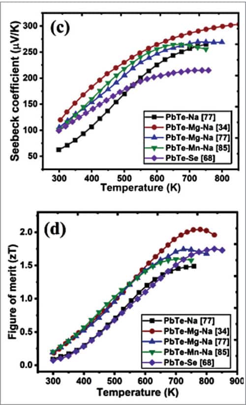 Fig. 9: Seebeck coefficient and ZT of lead telluride TE material Recently researchers have enhanced the ZT of a sintered material to 1.8 (600°C) using a nanostructure forming technology. Further, an electrode material has been developed that contacts very well electrically and thermally with PbTe containing MgTe nanostructures, achieving a conversion efficiency of about 11% with hot side at 600°C and the cold side at 10°C.