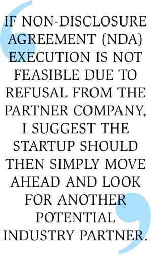In clear terms, an NDA is necessary at a stage where a startup is required to share any information which is not intended for the public domain. It may be a business proposal, idea, technical information, trade secret, patent information, etc. If NDA execution is not feasible due to refusal from the partner company, I suggest the startup should then simply move ahead and look for another potential industry partner.