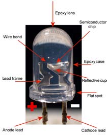 Fig. 1 shows the parts of a common type of LED structure. There are major differences between LEDs and other diode types. An LED has a transparent package, allowing visible or IR energy to pass through. Also, the LED has a large p-n junction area whose shape is tailored to the application.