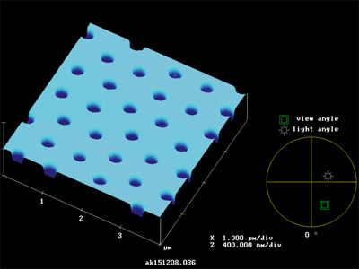 Display lighting is yet another area where LEDs are making great inroads. It was six years ago when LED-backlit liquid crystal display (LCD) televisions and computer monitors first appeared on the market and now all flat-screen LCD displays are being made with only LED backlighting. LEDs offer several performance benefits over the older technology of cold cathode fluorescent lamp (CCFL) sources for LCD display backlighting. Their use significantly cuts down on power usage, causes less heating, provides better lighting quality and enables much larger screen sizes than was possible with edge-lit CCFL-based backlights. Furthermore, use of LEDs can also lead to better picture contrast through use of a technique called dynamic dimming where LEDs, directly behind dark scenes, are dimmed in intensity to accentuate the overall contrast. Major TV manufacturers are also competing with each other in bringing out ever thinner TV sets and here too LEDs can provide a helping hand. This is due to their capability to produce customised angular emission patterns that enable the distance between the backlight and the LCD panel to be reduced, resulting in significantly thinner televisions. In order to achieve this, an array of shallow holes is etched on the surface of LEDs, as can be seen in the atomic force microscope image in figure 7. This array forms what is known as a photonic crystal – an ordered periodic structure that is essentially a two-dimensional diffraction grating. The photonic crystal serves two purposes. It modifies the spatial pattern of light exiting the LED and it also makes the LED brighter by extracting more light from deep inside the chip. Both effects are beneficial for LCD backlighting; making TVs both thinner and more power efficient.