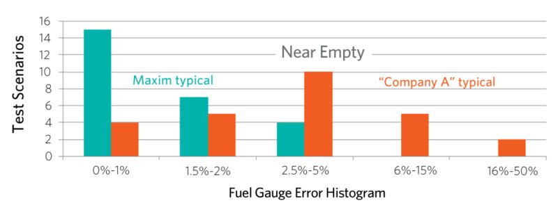 One of the main benefits of a fuel gauge is that the system designer can use it to decide when to shut down the device when the battery gets low. If the fuel gauge overestimates the battery life, the shutdown might not happen before the voltage falls below the minimum operating point, resulting in an unexpected crash. Alternately, if the designer shuts down the system prematurely, then the run-time becomes shorter, which is highly undesirable for the user. By offering the industry’s most accurate fuel gauge—within 1% state of charge (SOC) error for most cases—the MAX17055 allows the designer to plan for a shutdown that maximizes the device run-time.